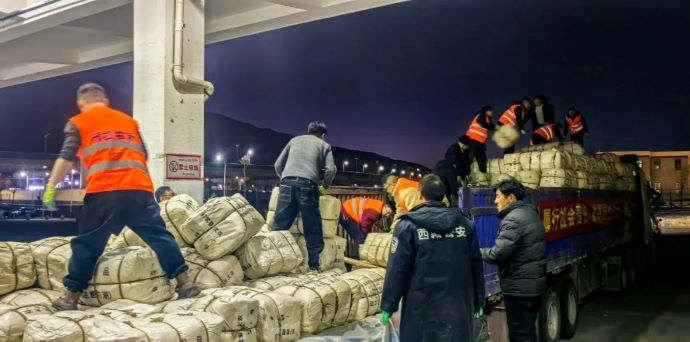 1月9日20點(diǎn),拉薩貢嘎國(guó)際機(jī)場(chǎng)貨站內(nèi)燈火通明,西藏開投集團(tuán)20多名工作人員正在緊急卸裝救援物資,一件件棉衣棉被下了飛機(jī)立即裝車,準(zhǔn)備運(yùn)往災(zāi)區(qū)。