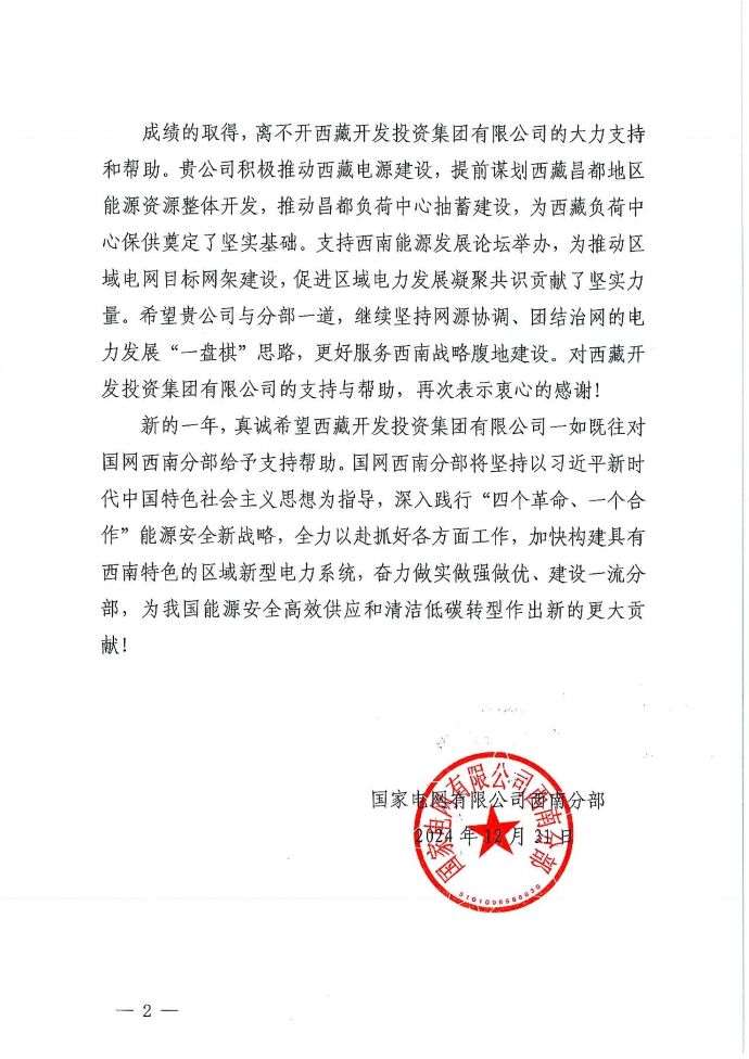 新年伊始,西藏開投集團(tuán)收到來自國網(wǎng)電力有限公司西南分部的一封感謝信,對集團(tuán)積極推動西藏電源建設(shè),提前謀劃西藏昌都地區(qū)能源資源整體開發(fā),推動昌都負(fù)荷中心抽蓄建設(shè),以及支持西南能源發(fā)展論壇舉辦,推動區(qū)域電網(wǎng)目標(biāo)網(wǎng)架建設(shè),促進(jìn)區(qū)域電力發(fā)展凝聚共識作出的貢獻(xiàn)表示感謝。