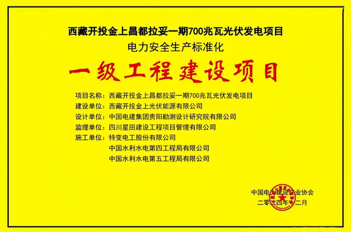 西藏開投金上拉妥一期700MW光伏發(fā)電項(xiàng)目于2021年12月13日取得備案批復(fù)文件,2024年12月底主體工程建設(shè)完成,具備并網(wǎng)發(fā)電條件,并于當(dāng)年12月順利通過電力建設(shè)工程安全生產(chǎn)標(biāo)準(zhǔn)化一級(jí)評(píng)審,榮獲中國(guó)電力建設(shè)企業(yè)協(xié)會(huì)頒發(fā)的“電力安全生產(chǎn)標(biāo)準(zhǔn)化一級(jí)工程建設(shè)項(xiàng)目”榮譽(yù)。