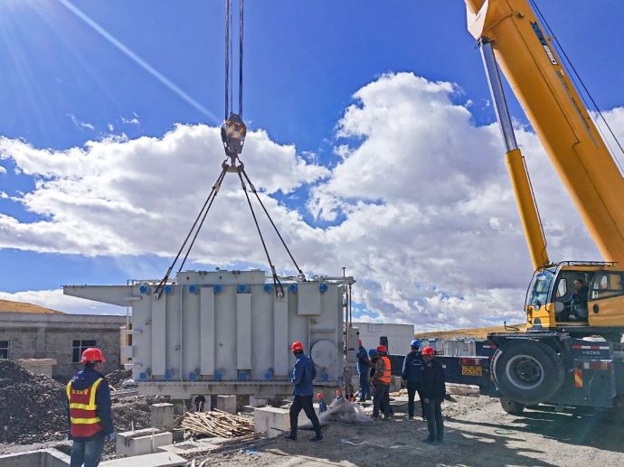 色尼區(qū)達嘎普獨立儲能項目svg預(yù)制艙吊裝。吳昊澄 攝