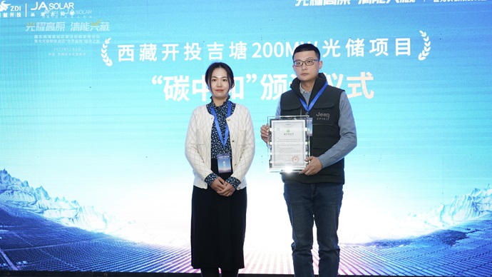 論壇上,CTC國檢光伏檢驗認(rèn)證院為昌都市察雅縣吉塘200MW+160MWh儲能牧光互補復(fù)合型光伏項目(以下簡稱吉塘200MW項目)頒發(fā)“碳中和”證書。吉塘200MW項目是西藏自治區(qū)第一個被認(rèn)證的,也是運營階段最早的碳中和光伏(儲)發(fā)電站項目,具有良好的經(jīng)濟社會效益以及能源優(yōu)勢互補效益,為加快建設(shè)藏東國家清潔能源基地作出了重要示范作用。