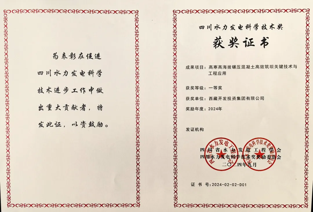 9月25日,四川省水力發(fā)電工程學會2024年度學術(shù)年會在成都召開,并舉辦2024年四川水力發(fā)電科學技術(shù)獎頒獎典禮,西藏開投集團果多水電站創(chuàng)新成果“高寒高海拔碾壓混凝土高效筑壩關(guān)鍵技術(shù)與工程應(yīng)用”榮獲四川水力發(fā)電科學技術(shù)獎一等獎。