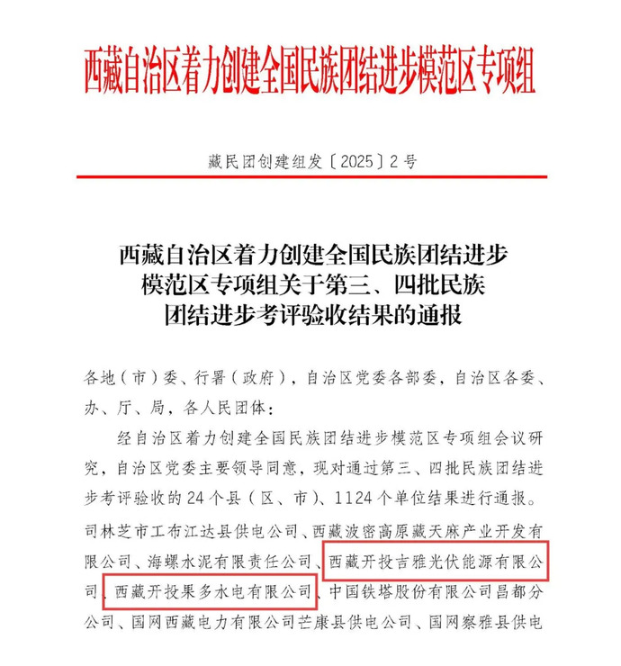近日,西藏自治區(qū)著力創(chuàng)建全國(guó)民族團(tuán)結(jié)進(jìn)步模范區(qū)專(zhuān)項(xiàng)組印發(fā)《西藏自治區(qū)著力創(chuàng)建全國(guó)民族團(tuán)結(jié)進(jìn)步模范區(qū)專(zhuān)項(xiàng)組關(guān)于第三、四批民族團(tuán)結(jié)進(jìn)步考評(píng)驗(yàn)收結(jié)果的通報(bào)》,西藏開(kāi)投吉雅光伏公司、果多水電公司位列第四批考評(píng)驗(yàn)收單位名單。