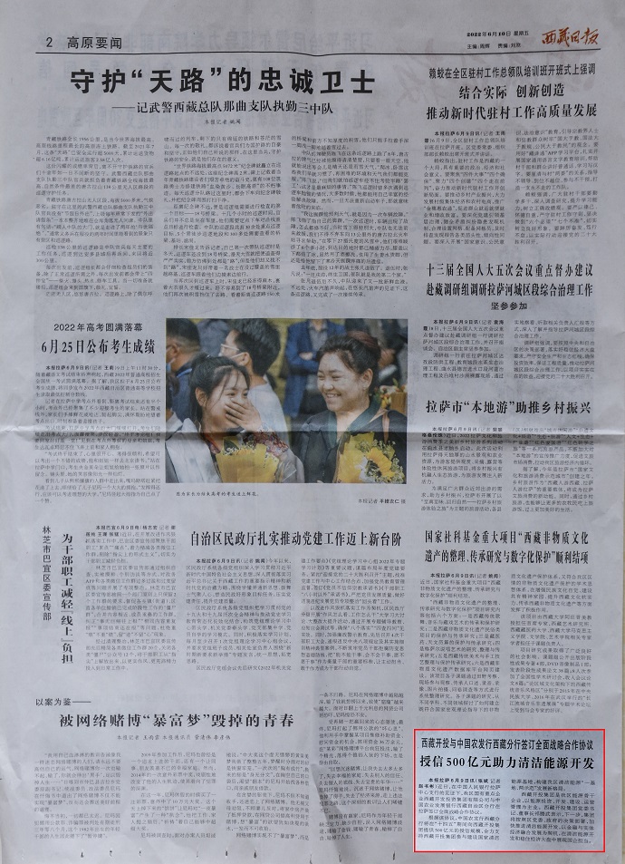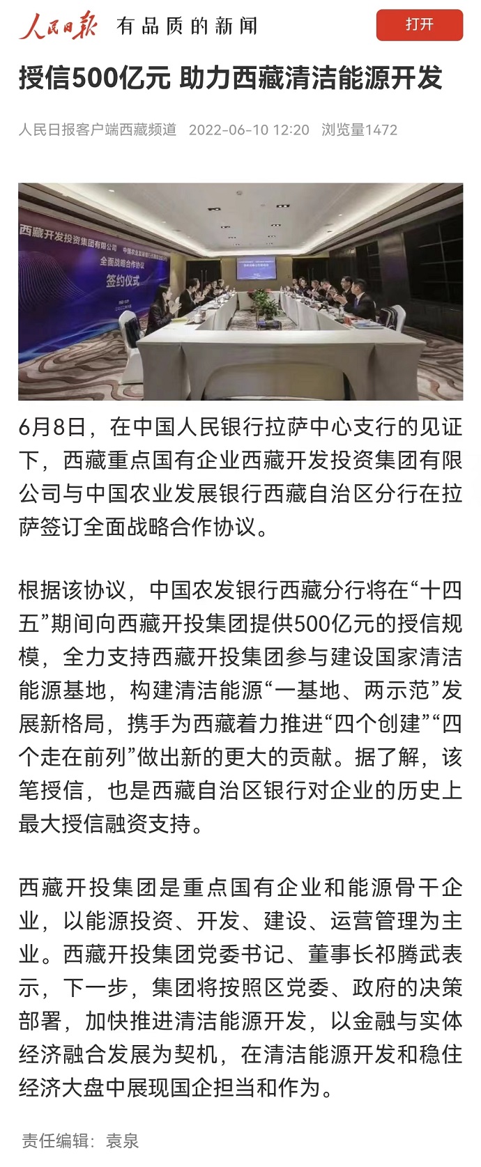 (編者按)6月10日,《人民日?qǐng)?bào)》客戶端西藏頻道報(bào)道了《授信500億元 助力西藏清潔能源開發(fā)》。《西藏日?qǐng)?bào)》2022年6月10日在第2版“高原要聞”欄目刊登文章,報(bào)道《授信500億元|西藏開投集團(tuán)與中國(guó)農(nóng)發(fā)行西藏分行簽訂全面戰(zhàn)略合作協(xié)議》。西藏電視臺(tái)2022年6月10日在西藏電視臺(tái)影視文化頻道《今晚九點(diǎn)》欄目報(bào)道了《授信500億元|西藏開投集團(tuán)與中國(guó)農(nóng)發(fā)行西藏分行簽訂全面戰(zhàn)略合作協(xié)議》,《珠峰云》平臺(tái)同步播放。新華網(wǎng)、經(jīng)濟(jì)日?qǐng)?bào)、西藏衛(wèi)視、西藏日?qǐng)?bào)客戶端、網(wǎng)信西藏、今日頭條等媒體均報(bào)道了相關(guān)新聞。全文如下: