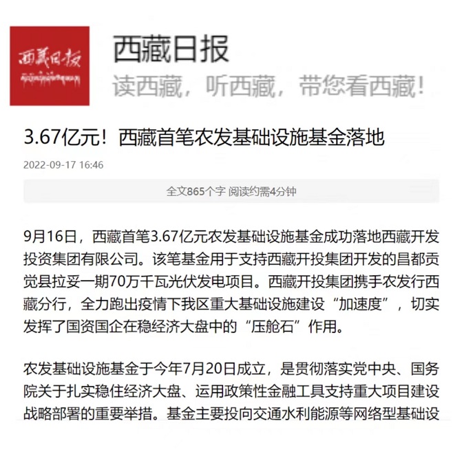 ?。ň幷甙矗段鞑厝請蟆?022年9月17日報道西藏首筆農(nóng)發(fā)基礎(chǔ)設(shè)施基金落地西藏開投集團(tuán)。全文如下: