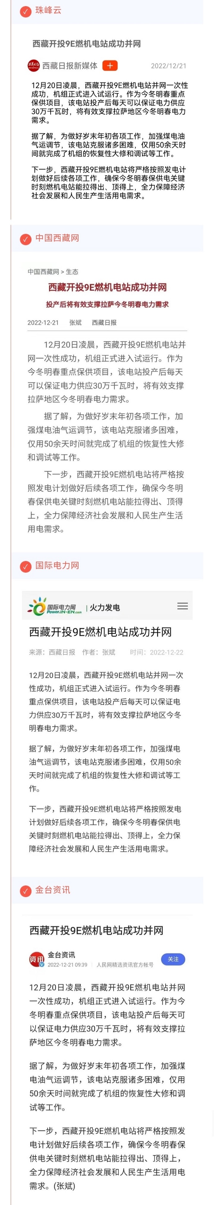 西藏衛(wèi)視(西藏新聞聯(lián)播)、珠峰云、中國西藏網(wǎng)、國際電力網(wǎng)及金臺資訊等媒體報道西藏開投9E燃機(jī)電站成功并網(wǎng)