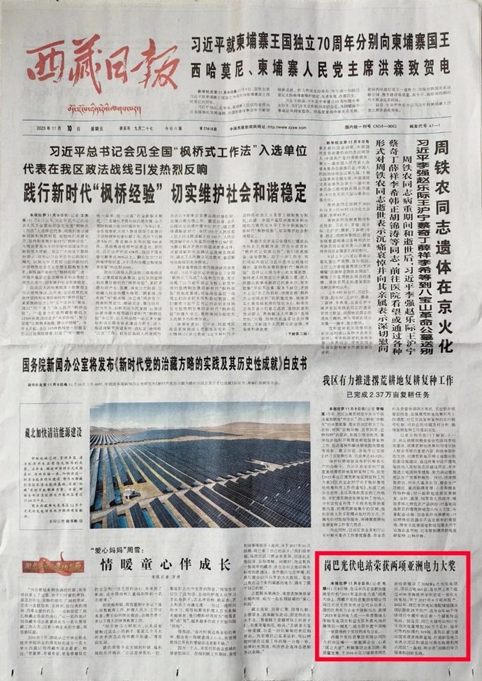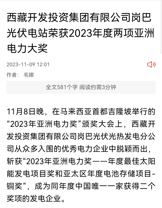科技日?qǐng)?bào)、西藏日?qǐng)?bào)、西藏日?qǐng)?bào)客戶(hù)端等多個(gè)媒體報(bào)道了《西藏開(kāi)發(fā)投資集團(tuán)有限公司崗巴光伏電站榮獲2023年度兩項(xiàng)亞洲電力大獎(jiǎng)》