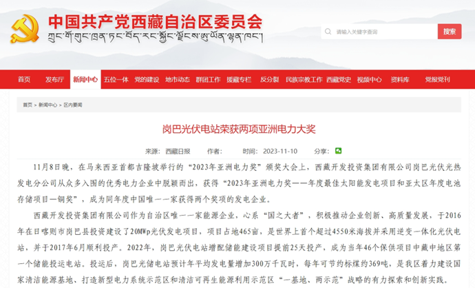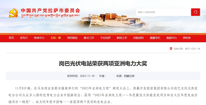 編者按:11月9-10日,科技日?qǐng)?bào)、西藏日?qǐng)?bào)、西藏日?qǐng)?bào)客戶(hù)端、新浪財(cái)經(jīng)客戶(hù)端、中國(guó)西藏網(wǎng)、中國(guó)共產(chǎn)黨西藏自治區(qū)委員會(huì)官網(wǎng)、中國(guó)共產(chǎn)黨拉薩市委員會(huì)官網(wǎng)等多個(gè)媒體報(bào)道了《西藏開(kāi)發(fā)投資集團(tuán)有限公司崗巴光伏電站榮獲2023年度兩項(xiàng)亞洲電力大獎(jiǎng)》。全文如下: