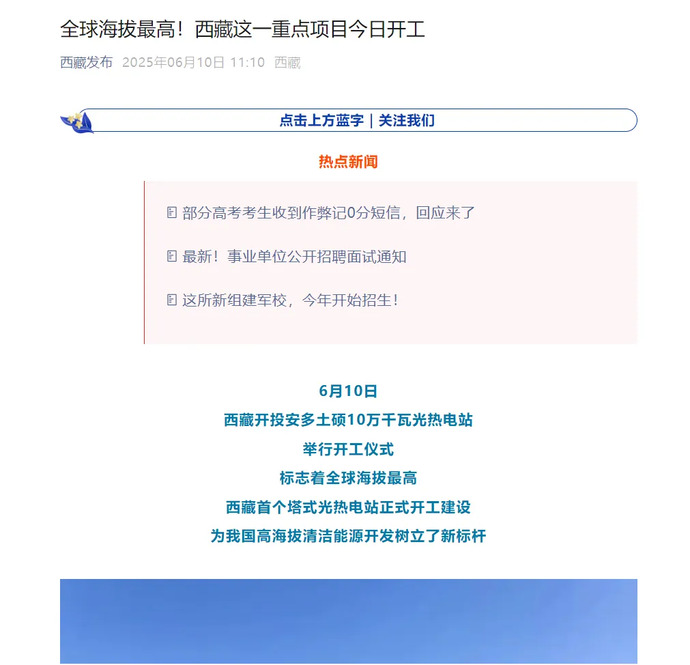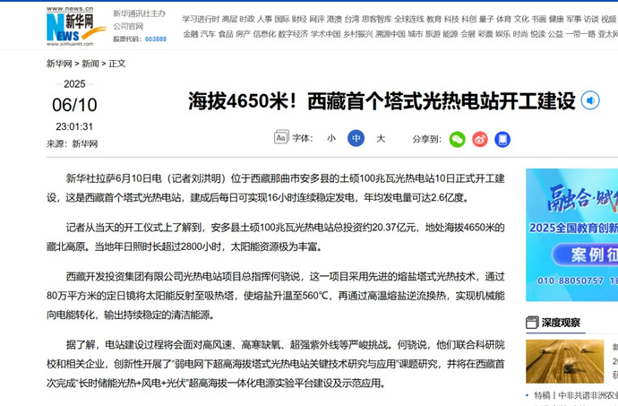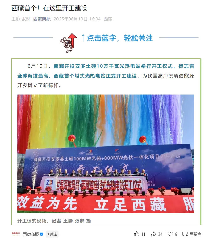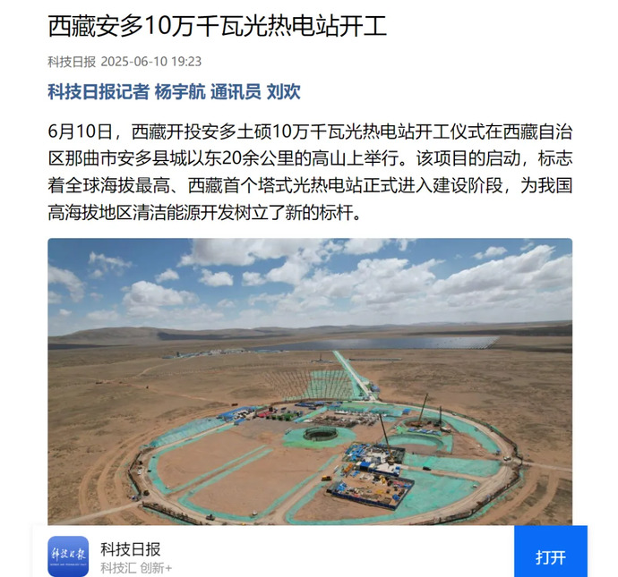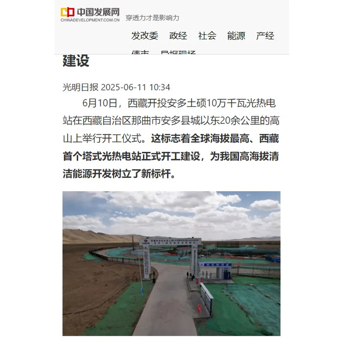 媒體報(bào)道丨全球海拔最高、西藏首個(gè)塔式光熱電站開(kāi)工建設(shè)