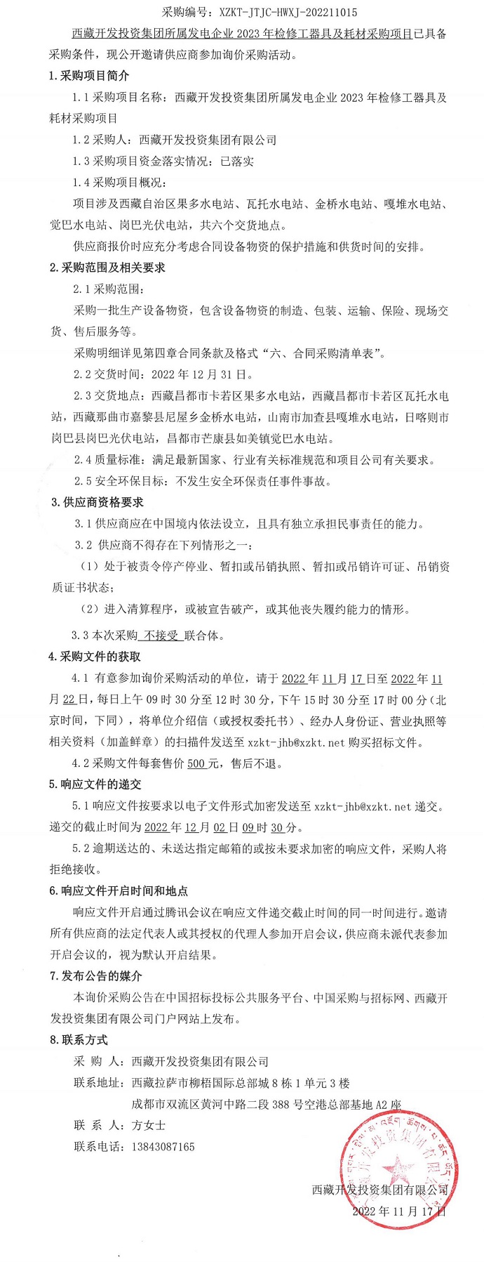 西藏開發(fā)投資集團所屬發(fā)電企業(yè)2023年檢修工器具及耗材公告