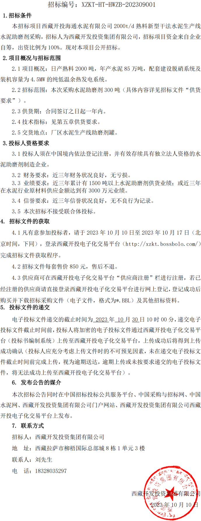 西藏開投海通水泥有限公司 2000t/d 熟料新型干法水泥生產(chǎn)線水泥助磨劑采購(gòu)招標(biāo)公告