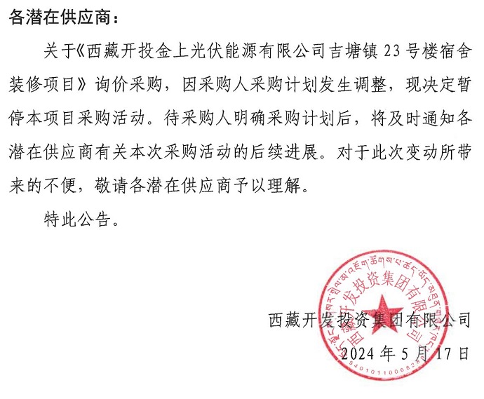 關(guān)于暫?!段鞑亻_投金上光伏能源有限公司吉唐鎮(zhèn)23號樓宿舍裝修項(xiàng)目》詢價(jià)采購活動的公告