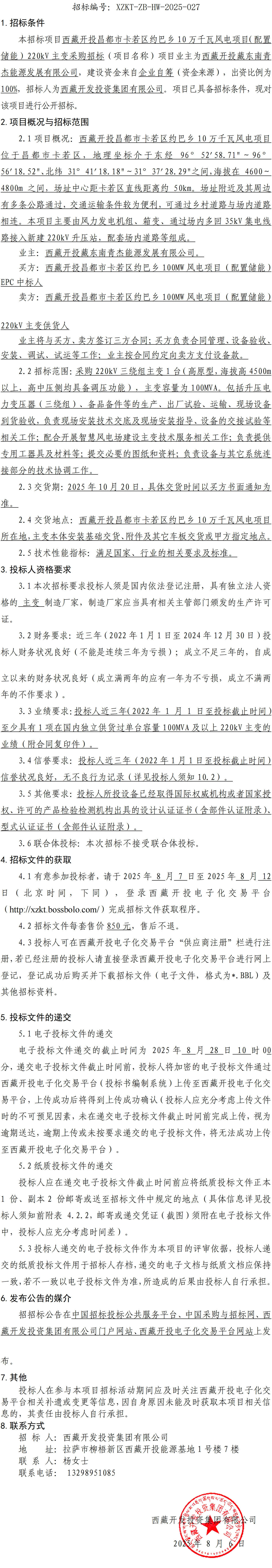 西藏開投昌都市卡若區(qū)約巴鄉(xiāng) 10 萬千瓦風(fēng)電項(xiàng)目(配置儲(chǔ)能)220kV 主變采購招標(biāo)公告
